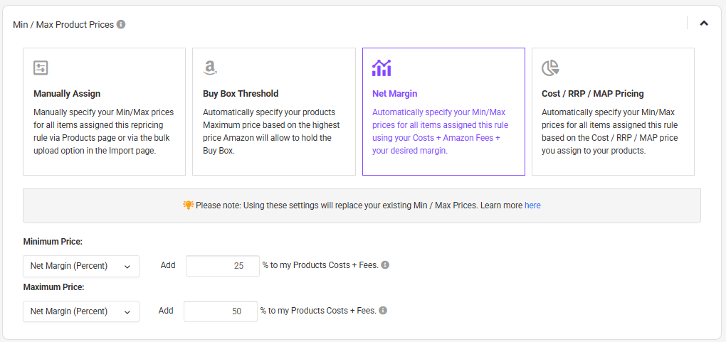 Repricer's Net Margin Repricing is a rule feature which allows you to have your Min Max prices generated automatically. Repricer will automatically download your Amazon Fees, so all you need to do is set your costs and desired Margin, Repricer will then do the rest!
