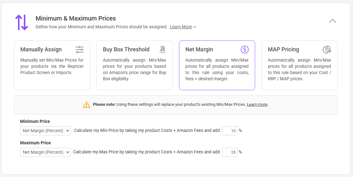 Repricer's Net Margin Repricing is a rule feature which allows you to have your Min Max prices generated automatically. Repricer will automatically download your Amazon Fees, so all you need to do is set your costs and desired Margin, Repricer will then do the rest!