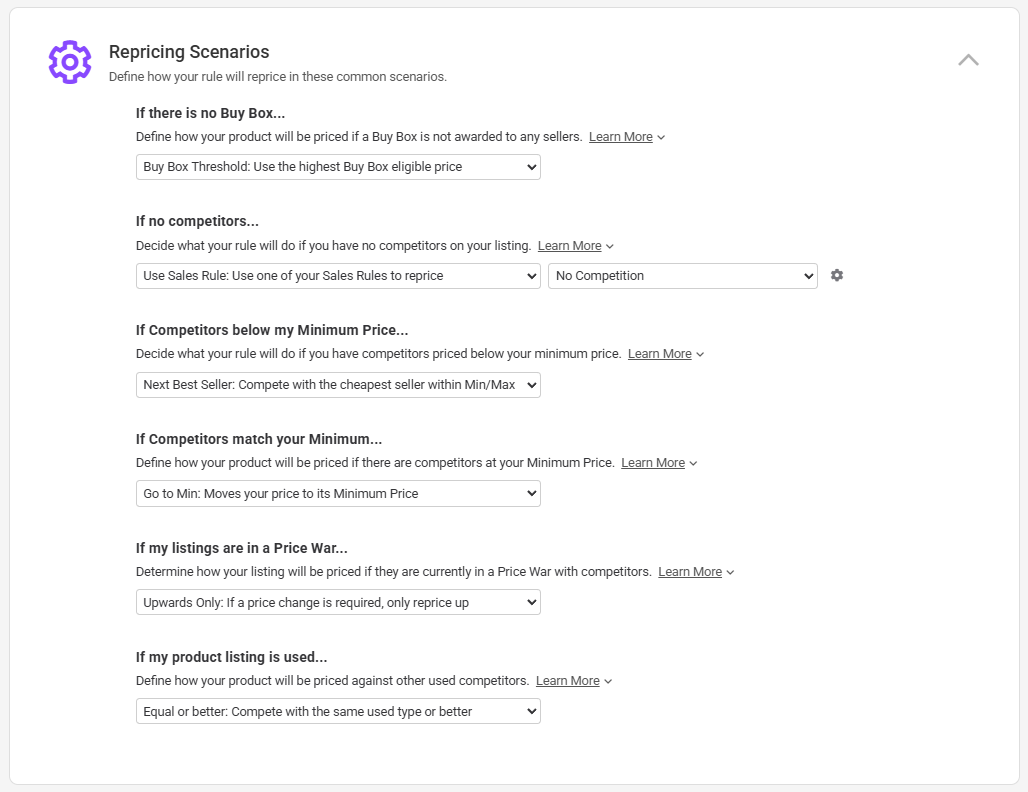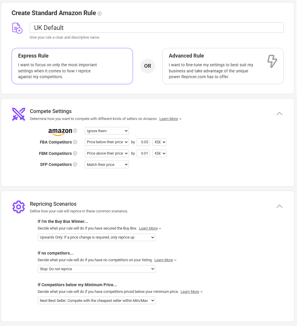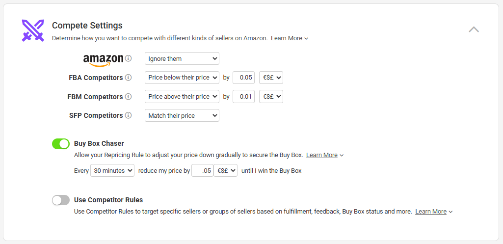 Competitor Rules allow you to setup a Rule within a Rule, targetting specific sellers or types of sellers in different ways. For example, you could use them to target FBA Sellers differently from FBM sellers. We have a guide on how to implement that specific setup into your Competitor Rules in this article.