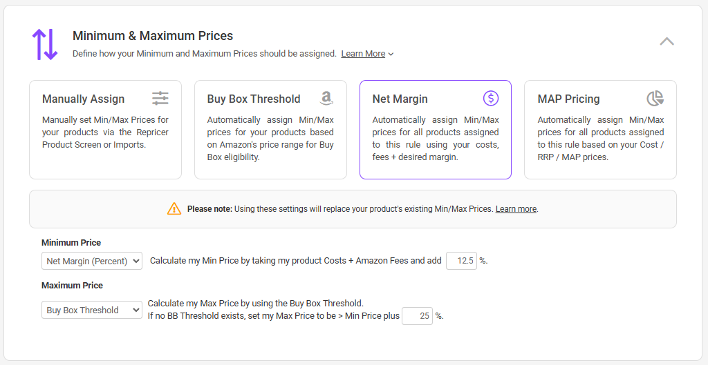 - Net Margin: Allow Repricer to calculate your Min Max prices using your Costs, Amazon Fees, and your desired margin.