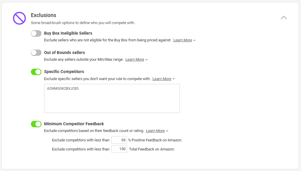 The next two options are very similar so we'll cover them together. Exclude Amazon, when turned on will stop you from competing with Amazon as a seller. To use Exclude Specific Merchants, paste the Seller ID of any specific sellers you don’t want to compete against. Include one Seller ID per line. If you don't know how to find your competitor's SellerID, find out how in this article.