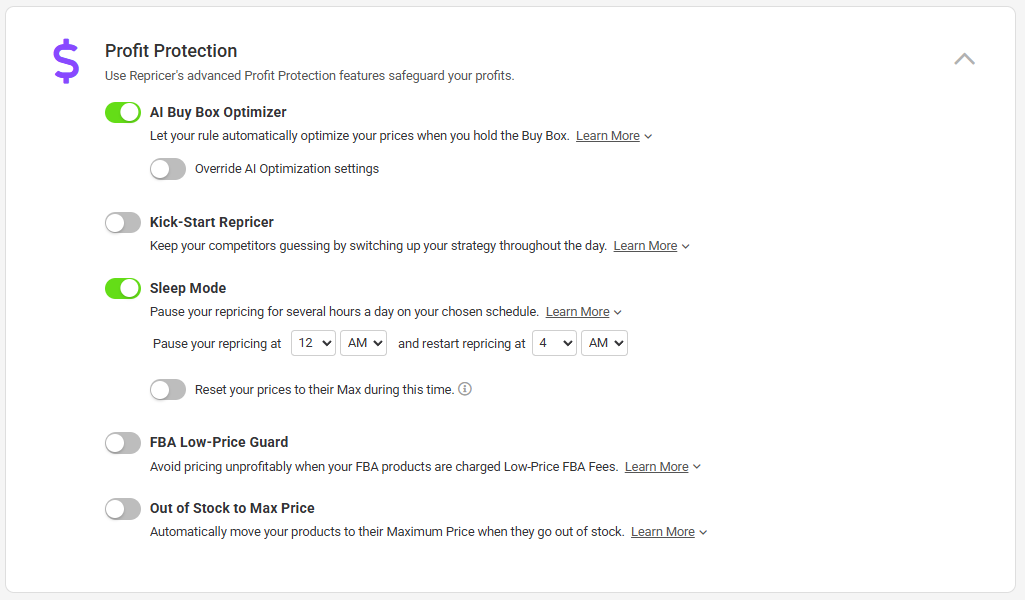 Sleep Mode: Sleep Mode lets you determine a period each day when your Repricing Rule will pause repricing entirely. You can also increase your price to Max during these periods. Learn more about Sleep Mode in this article.