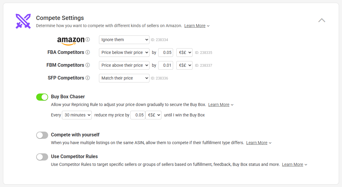 Every Repricing Rule comes with Compete Settings. These Compete Settings determine how you are going to compete with other sellers. You can use your Compete Settings to price against FBA, SFP, MFN and Amazon as a seller in different ways. For example, beat FBA sellers by 10c, or price match against SFP sellers. Your Amazon metrics will allow you to determine the best Compete Settings for you to use.Your Compete Settings effectively work as a broad brush, applying to all competitors. But we know that not all competitors are equal, and there are some you'd want to compete with differently. For example, you may wish to be less aggressive against sellers with lower feedback or slower shipping times. This is where Competitor Rules come in.
