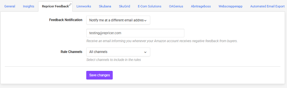 Within the Feedback Notification section, you can choose to receive notifications to your Repricer.com account admin email address or a different email if you prefer.